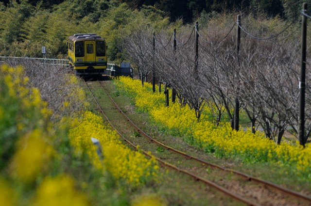 線路の両側に菜の花が続きます。ここが見せ場とばかりに列車がやってきました。